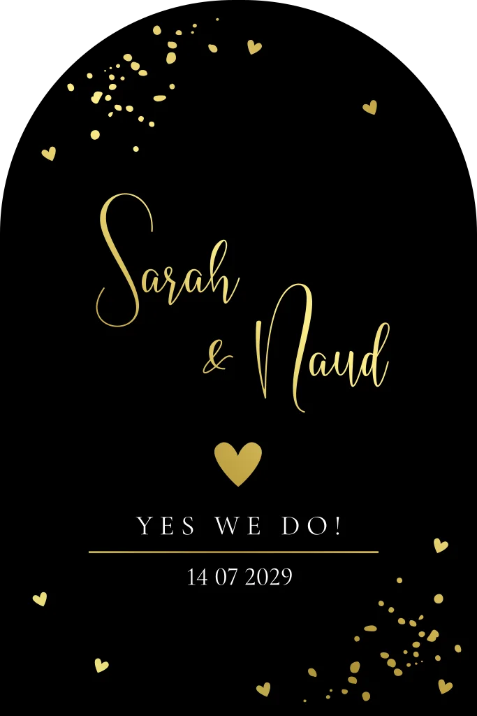 Stijlvolle trouwkaart zwart in boog vorm met spetters, hartjes en goudfolie. Nodig jullie gasten uit met deze originele boog vorm trouwkaart!
