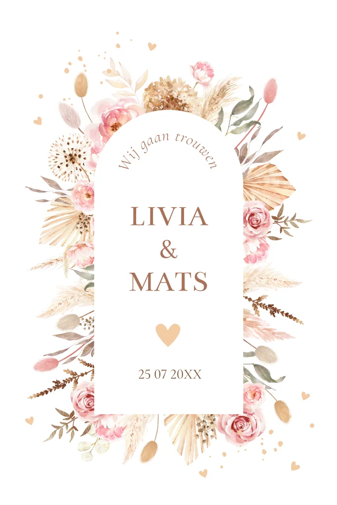 Trouwkaart in de vorm van een boog met bohemian bloemen roze. Nodig jullie gasten uit met deze bohemian stijl trouwkaart!