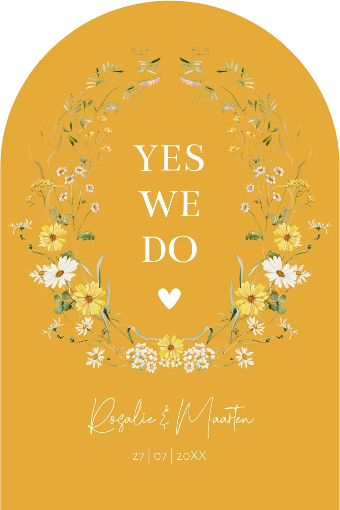 Stijlvolle trouwkaart geel met bloemen en bladeren in boog vorm. Pas de kleuren naar wens aan!