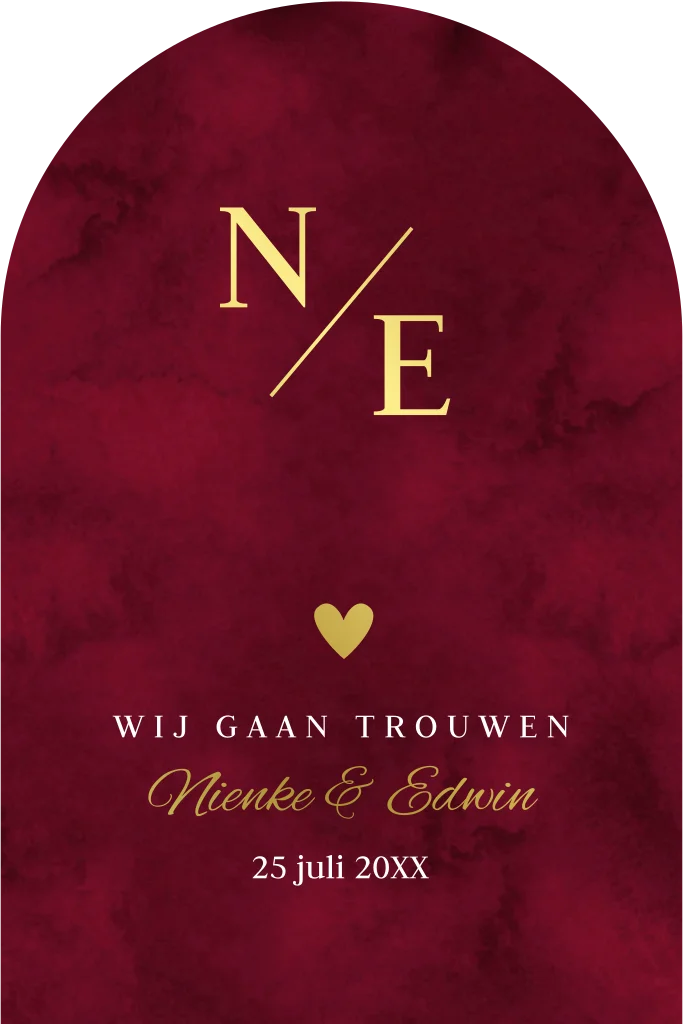 Trouwkaart rood in originele boog vorm met goudfolie. Nodig jullie gasten uit met deze prachtige originele trouwkaart!