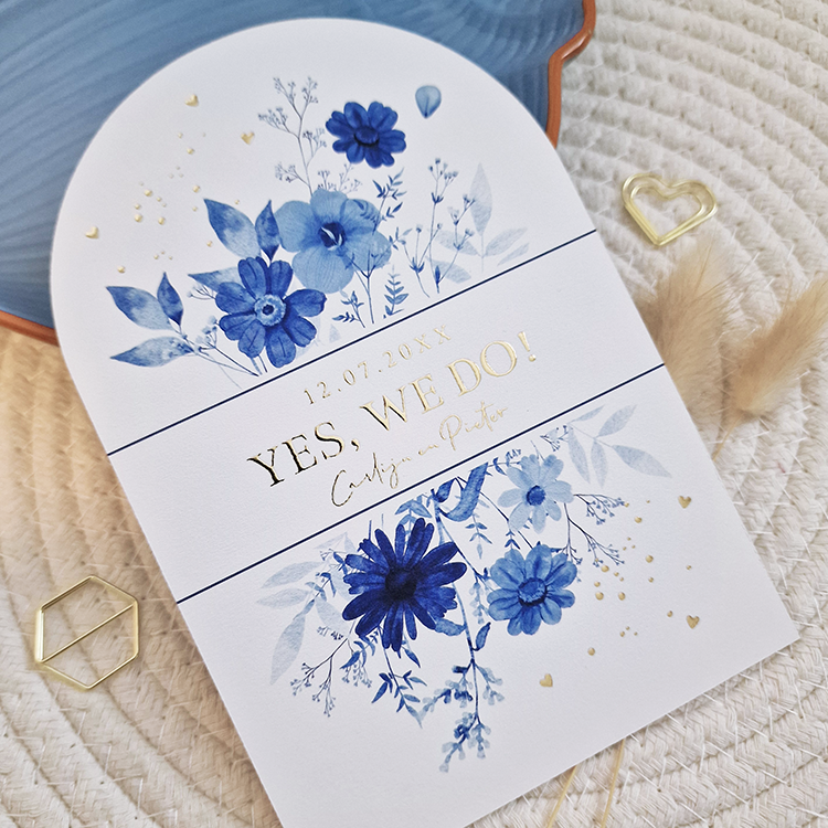 Trouwkaart in boog vorm met watercolour bloemen blauw en goudfolie. Nodig jullie gasten uit met deze prachtige originele trouwkaart in Delfts Blauw thema!