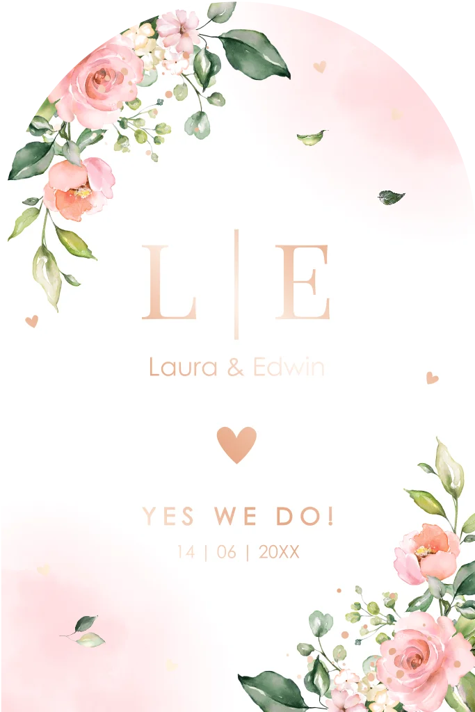 Stijlvolle trouwkaart roze in boog vorm met aquarel bloemen en rosegoudfolie. Nodig jullie bruiloftsgasten uit met deze romantische trouwuitnodiging!
