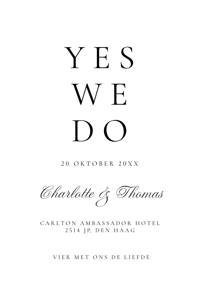 Klassieke trouwkaart wit zwart in originele golvende vorm. Nodig jullie gasten in stijl uit met deze prachtige trouwkaart. Pas de kleuren naar wens aan.