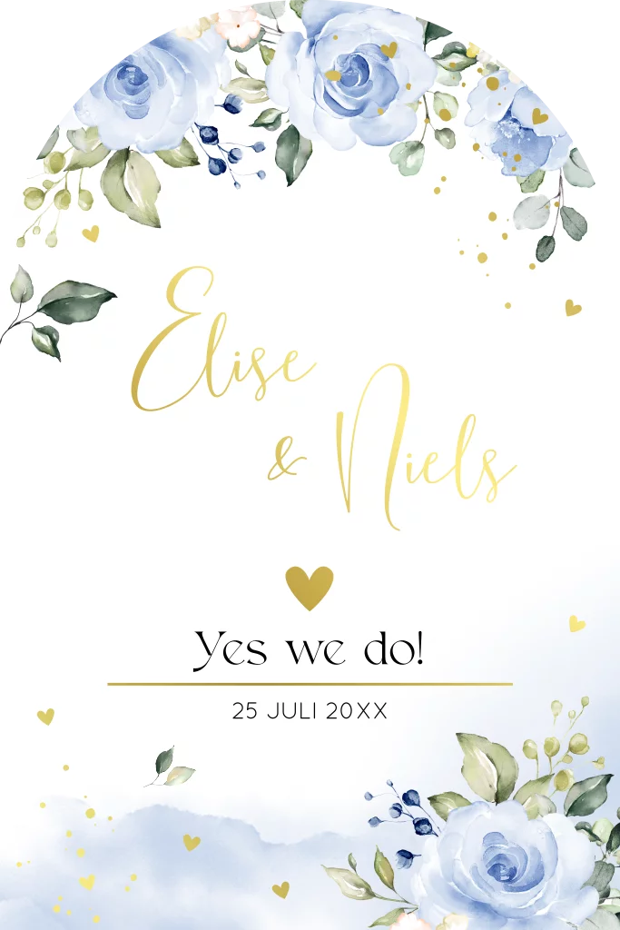 Stijlvolle trouwkaart in boog vorm met watercolour bloemen blauw en goudfolie. Nodig jullie gasten uit met deze mooie romantische trouwkaart.