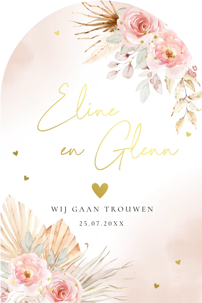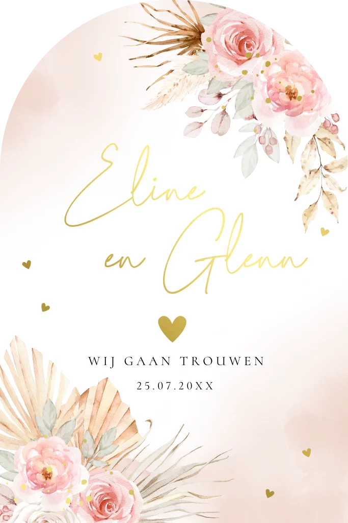 Trouwkaart bohemian bloemen roze goudfolie boog