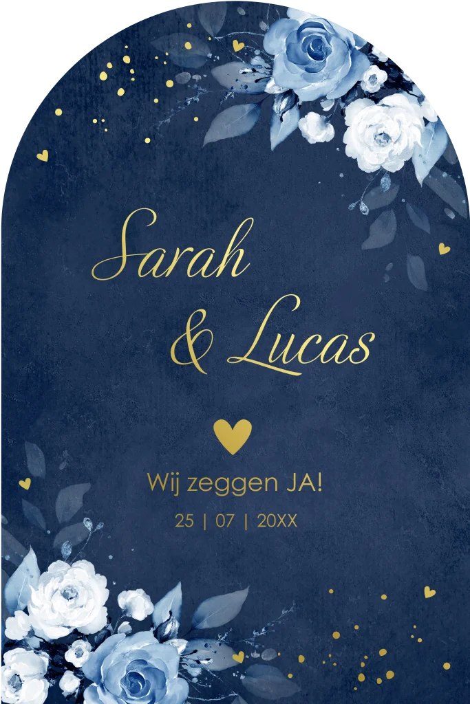 Trouwkaart donkerblauw bloemen goudfolie boog Blue Flowers