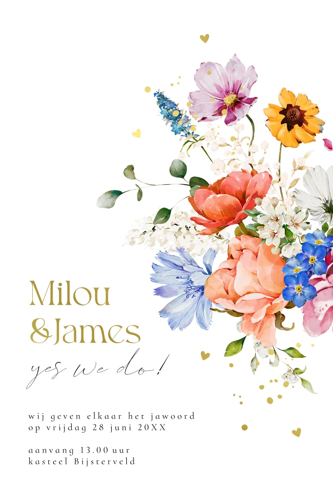 Trouwkaart in de vorm van een boog met fel gekleurde bloemen en goudfolie. Nodig jullie gasten uit met deze prachtige trouwkaart!