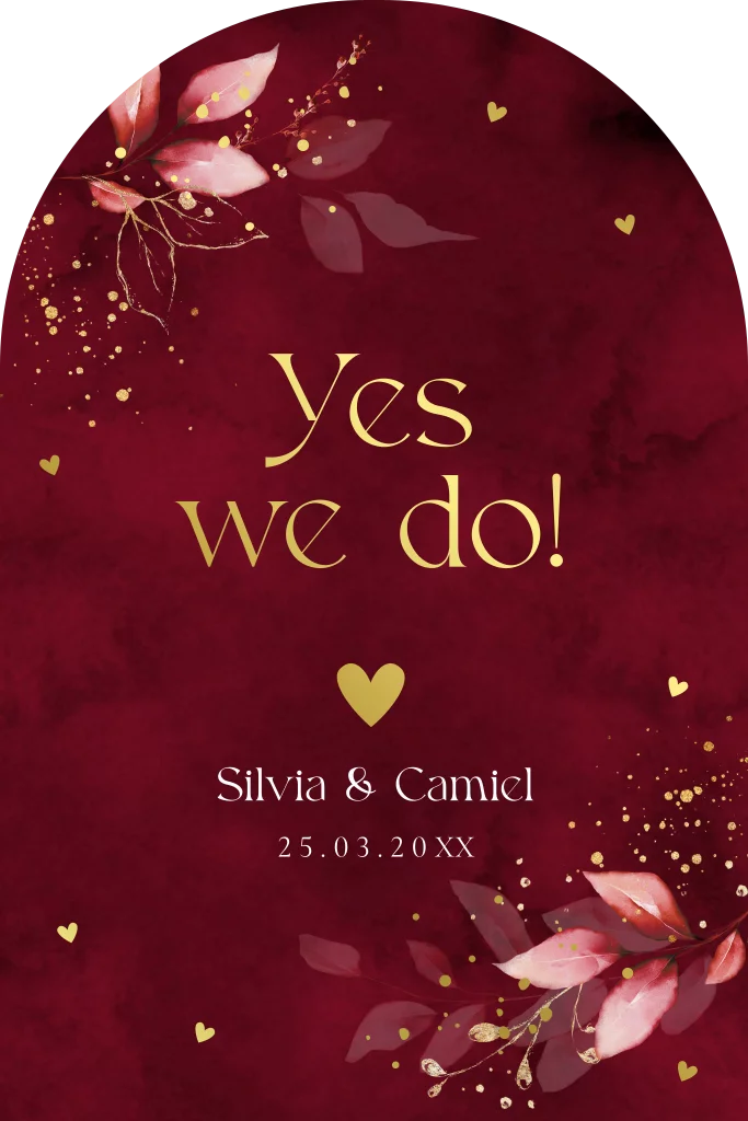 Stijlvolle trouwkaart rood in boog vorm met botanische bladeren en goudfolie. Nodig jullie gasten uit voor jullie bruiloft met deze prachtige originele trouwkaart!
