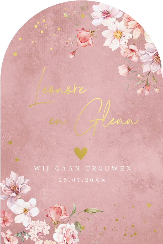 Trouwkaart roze bloemen goudfolie boog dusty pink
