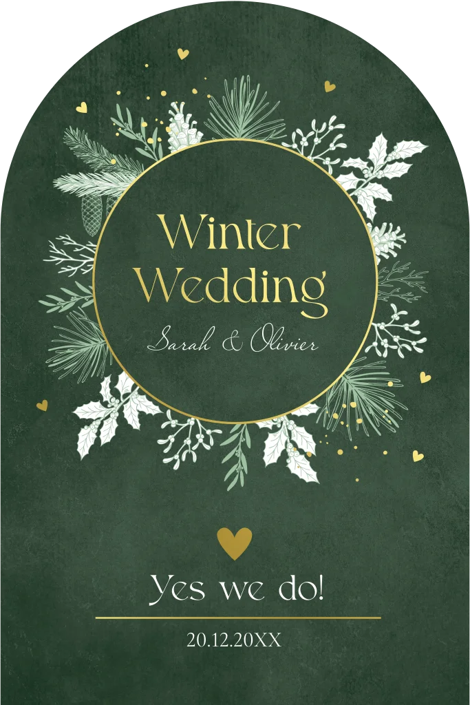 Trouwkaart winter wedding groen in boog vorm met mooie kerstkrans en goudfolie.