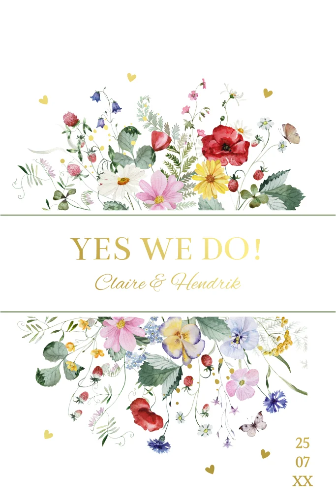 Trouwkaart wit veldbloemen forrest boog goudfolie