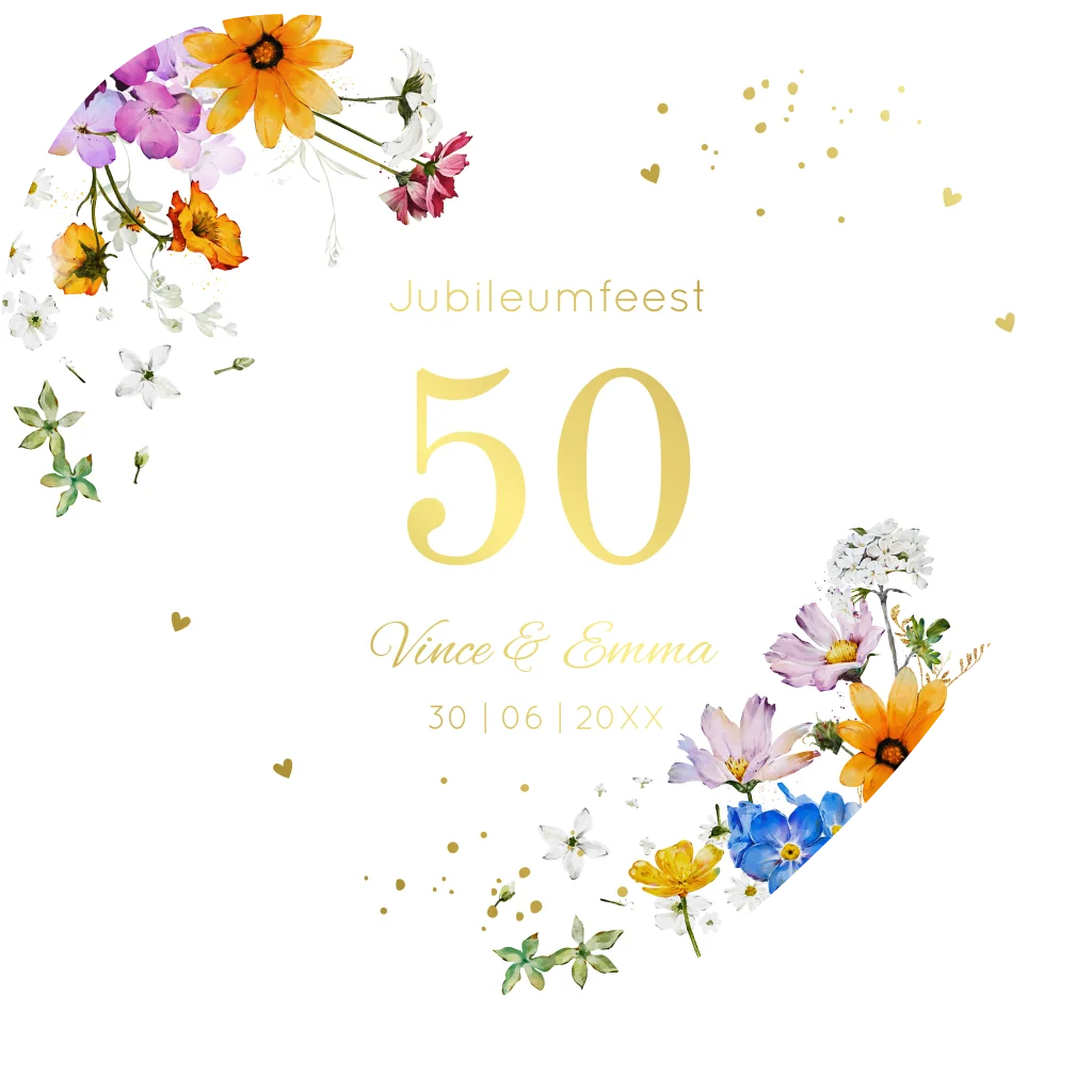 Uitnodiging jubileum 50 jaar getrouwd in de vorm van een hartje met zomerse bloemen en goudfolie.