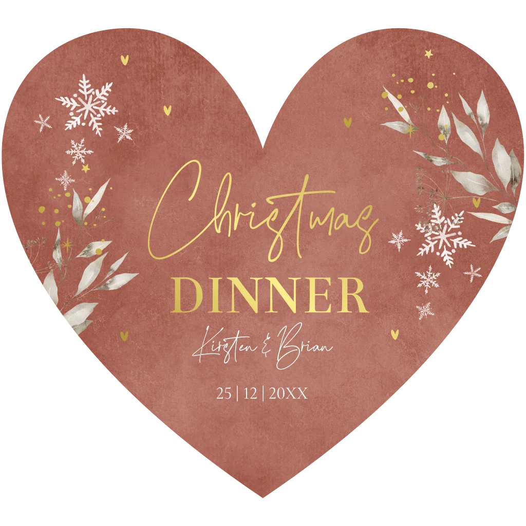 Kerstdiner uitnodiging is de vorm van een hartje met botanische bladeren, terracotta kleur en goudfolie.