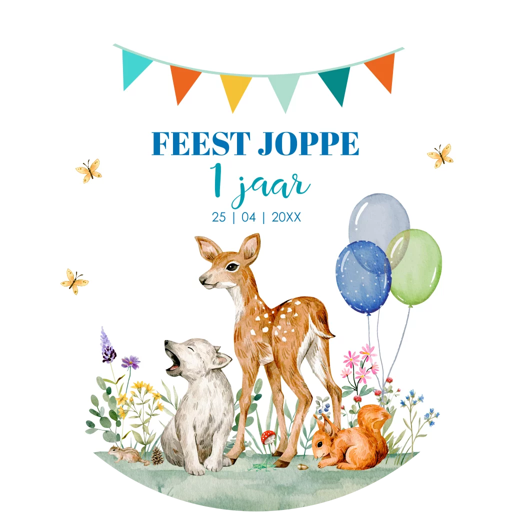 Uitnodiging kinderfeestje 1 jaar rond bosdieren slinger ballonnen