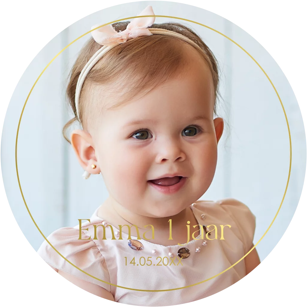 Uitnodiging kinderfeestje meisje 1 jaar in speciale ronde vorm met eigen foto en goudfolie. Nodig jullie gasten uit voor een feetje met deze originele uitnodiging!