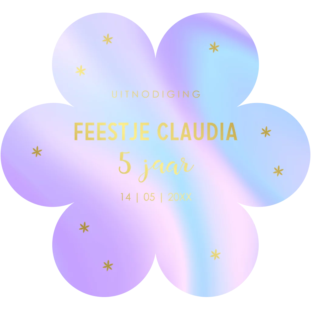Uitnodiging kinderfeestje voor een meisje in de vorm van een bloem met holografische print lila en goudfolie.