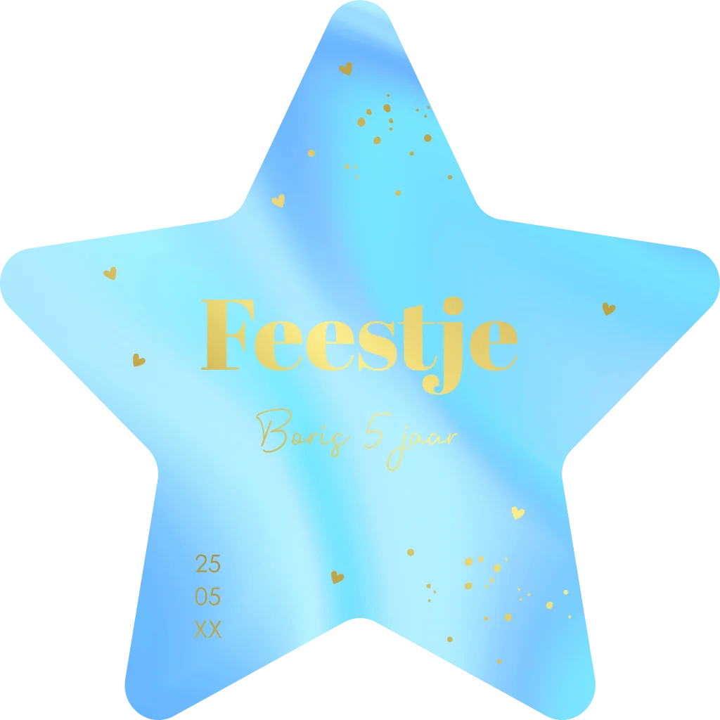 Uitnodiging kinderfeestje voor een jongen in ster vorm met holografisch print blauw en goudfolie.