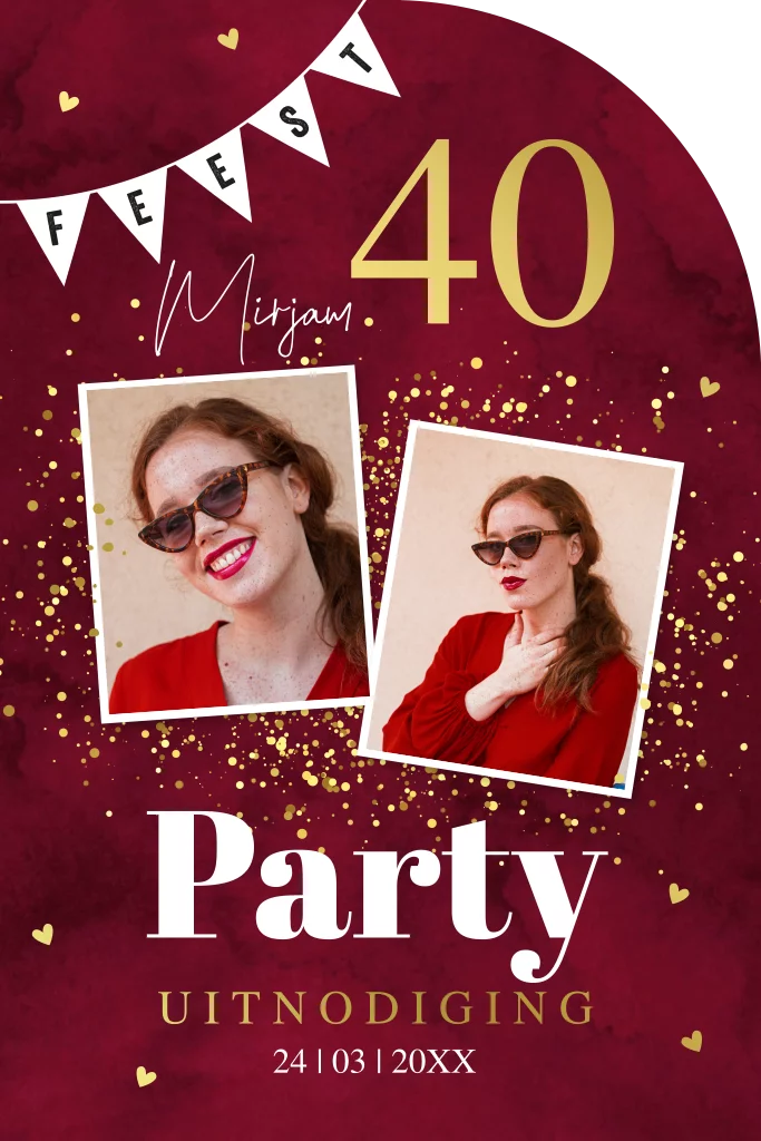 Uitnodiging verjaardag 40 jaar rood voor een vrouw met foto's, spetters, boog vorm en goudfolie.