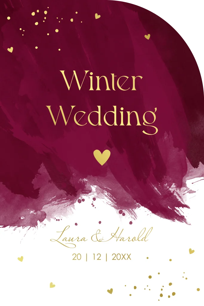 Winter Wedding kerst trouwkaart rood in boog vorm met goudfolie. De kaart wordt gestanst in een unieke boogvorm. Pas de kleur van de kaart en de folie naar wens aan. TIP: voeg een extra fotokaartje toe om de kaart persoonlijk te maken!