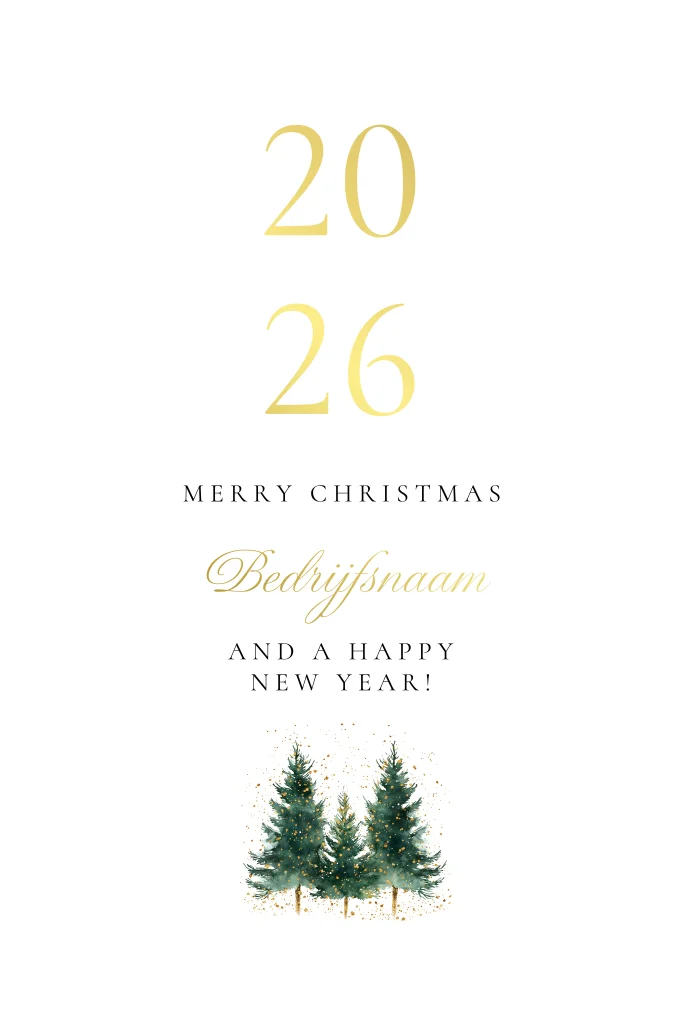 Zakelijke kerstkaart in golvende vorm wit met kerstbomen en goudfolie. Liever een andere kleur foliedruk? Pas deze eenvoudig aan in onze ontwerptool.