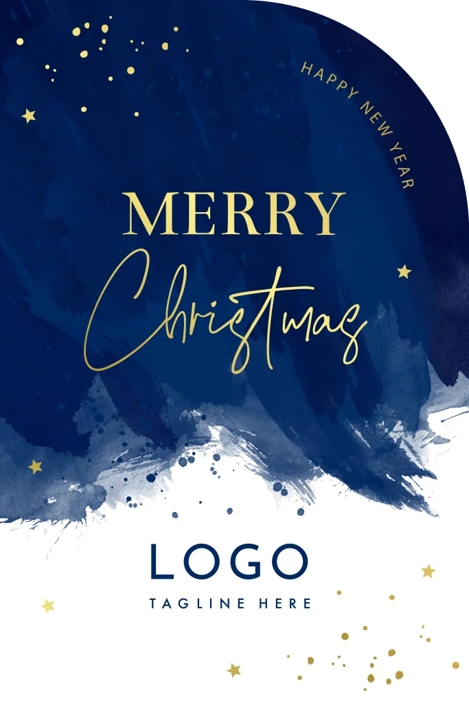 Zakelijke kerstkaart blauw in boogvorm met logo, watercolor en goudfolie. De kaart wordt gestanst in een unieke boogvorm. Pas de kleur van de kaart en de folie naar wens aan.