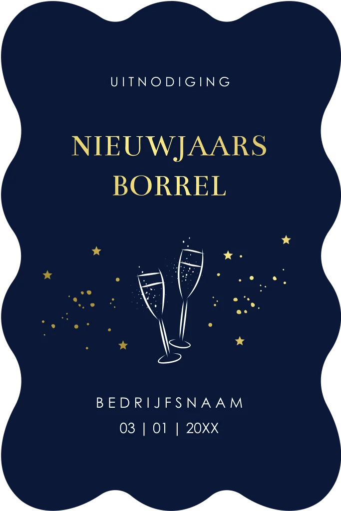 Luxe zakelijke uitnodiging Nieuwjaarsborrel donkerblauw in golvende vorm met goudfolie
