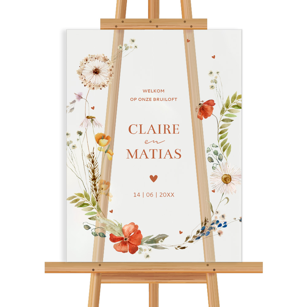 Een prachtig welkomstbord met veldbloemen rood gedrukt op transparant acryl. Met een bruiloftsbord maak je de styling op jullie bruiloft helemaal af! Dit bord wordt gedrukt op 5 mm dik plexiglas.