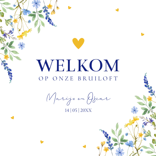 Verwelkom jullie gasten met een prachtig en persoonlijk welkomstbord met watercolour bloemen blauw geel. Pas gemakkelijk het design zelf aan en ga aan de slag met onze editor. Mocht je er niet uitkomen, neem dan gerust contact met ons op. Wij zijn er om je te helpen. Specificaties: • Formaat: 70 x 70 cm • Materiaal: forex 5 mm dik • Weersbestendig