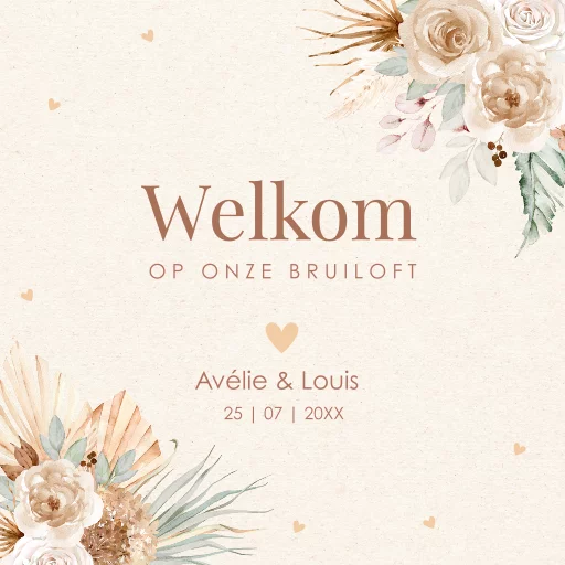 Verwelkom jullie gasten met een prachtig en persoonlijk welkomstbord. Pas gemakkelijk het design zelf aan en ga aan de slag met onze editor. Mocht je er niet uitkomen, neem dan gerust contact met ons op. Wij zijn er om je te helpen. Specificaties: • Formaat: 70 x 70 cm • Materiaal: forex 5 mm dik • Weersbestendig