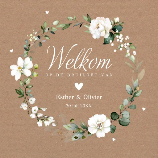 Verwelkom jullie gasten met een prachtig en persoonlijk welkomstbord. Pas gemakkelijk het design zelf aan en ga aan de slag met onze editor. Mocht je er niet uitkomen, neem dan gerust contact met ons op. Wij zijn er om je te helpen. Specificaties: • Formaat: 70 x 70 cm • Materiaal: forex 5 mm dik • Weersbestendig