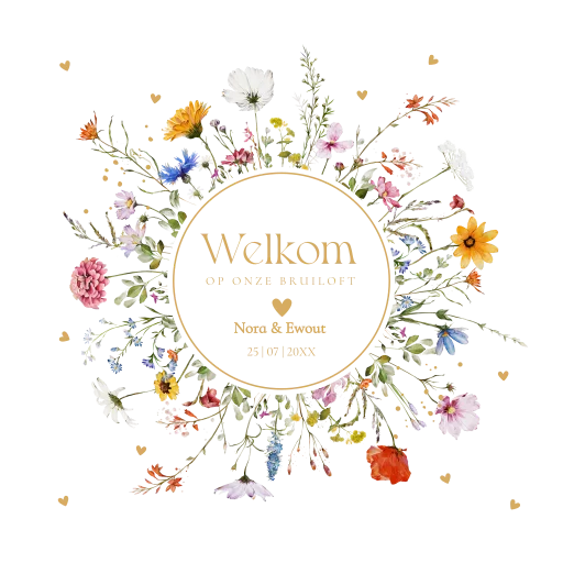 Welkomstbord bruiloft zomerse bloemenkrans