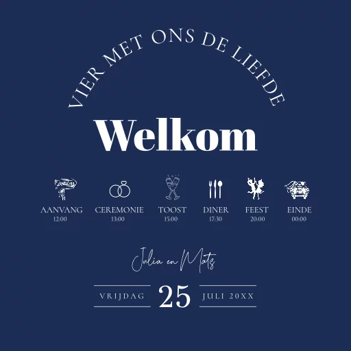 Bruiloftsbord donkerblauw welkom bruiloft icoontjes 70x70 cm