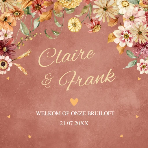 Verwelkom jullie gasten met een prachtig en persoonlijk welkomstbord. Pas gemakkelijk het design zelf aan en ga aan de slag met onze editor. Mocht je er niet uitkomen, neem dan gerust contact met ons op. Wij zijn er om je te helpen. Specificaties: • Formaat: 70 x 70 cm • Materiaal: forex 5 mm dik • Weersbestendig