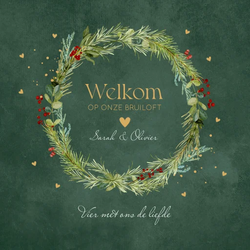 Bruiloftsbord welkom op onze bruiloft groen met mooie kerstkrans.