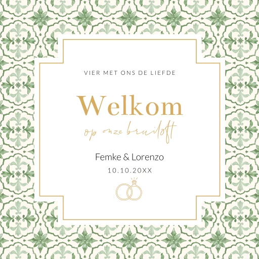 Welkom jullie gasten in stijl met het prachtige Bruiloftsbord mediterraans patroon in groen. Dit persoonlijke welkomstbord is perfect om een warme en uitnodigende sfeer te creëren voor jullie speciale dag. Pas gemakkelijk het design zelf aan en ga aan de slag met onze editor. Mocht je er niet uitkomen, neem dan gerust contact met ons op. Wij zijn er om je te helpen. Specificaties: • Formaat: 70 x 70 cm • Materiaal: forex 5 mm dik • Weersbestendig