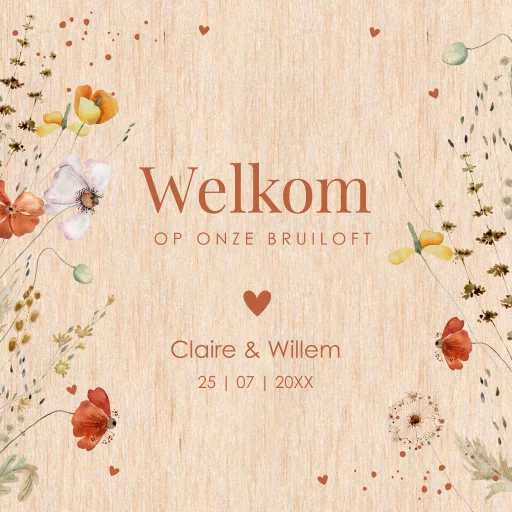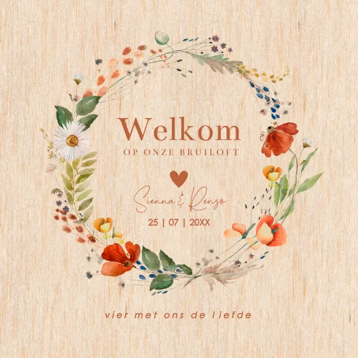 Verwelkom jullie gasten met een prachtig en persoonlijk welkomstbord (geen echt hout). Pas gemakkelijk het design zelf aan en ga aan de slag met onze editor. Mocht je er niet uitkomen, neem dan gerust contact met ons op. Wij zijn er om je te helpen. Specificaties: • Formaat: 70 x 70 cm • Materiaal: forex 5 mm dik • Weersbestendig