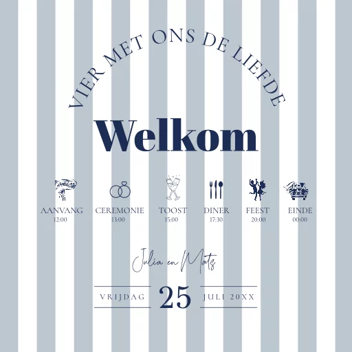 Bruiloftsbord strepen blauw welkom bruiloft icoontjes 70x70 cm