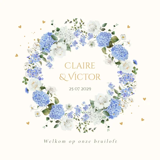 Bruiloftsbord bloemenkrans blauw hortensia