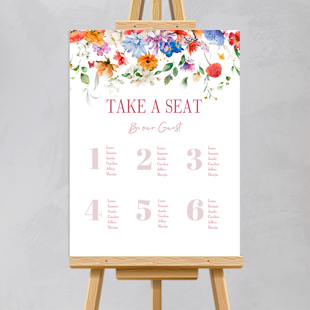 Maak eenvoudig zelf een bord met de tafelschikking voor jullie bruiloft, in dezelfde stijl als jullie trouwkaart.