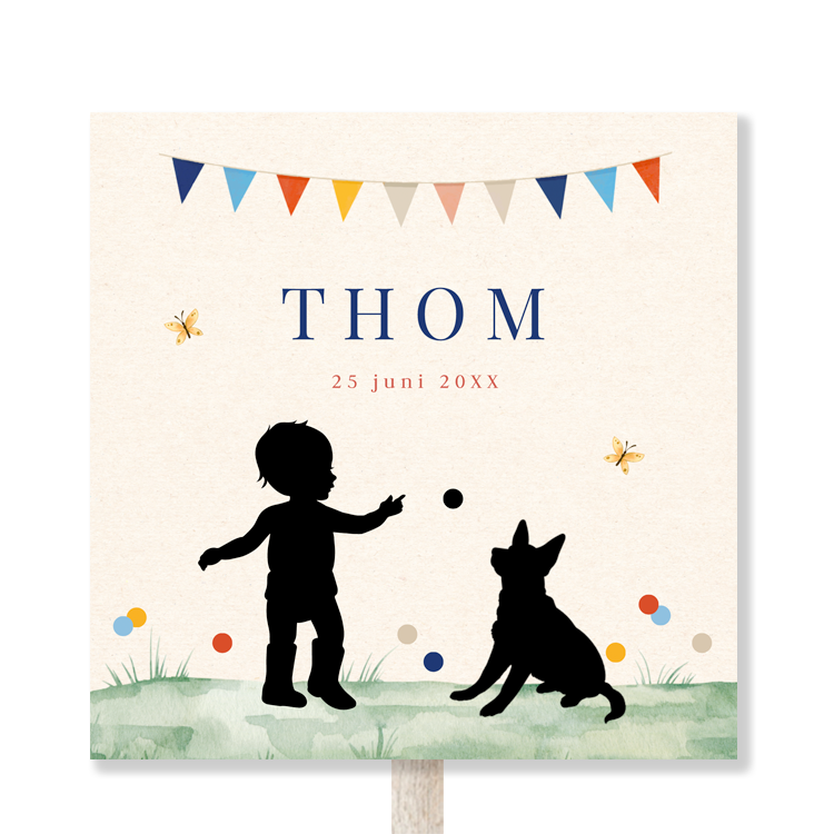 Tuinbord geboortekaartje silhouet jongen en hondje | 70x70 cm