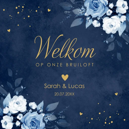 Welkomstbord bruiloft blauw bloemen rozen 70x70 cm