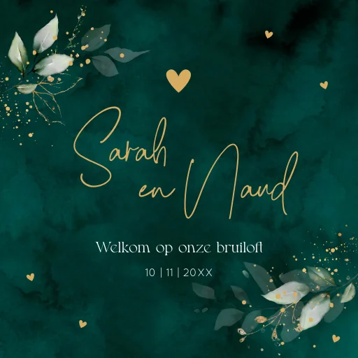 Welkomstbord bruiloft groen botanisch bladeren. Pas gemakkelijk het design zelf aan en ga aan de slag met onze editor. Mocht je er niet uitkomen, neem dan gerust contact met ons op. Wij zijn er om je te helpen. Specificaties: • Formaat: 70 x 70 cm • Materiaal: forex 5 mm dik • Weersbestendig