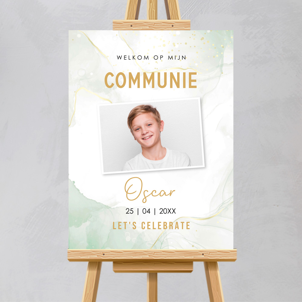 Welkomstbord communie groen watercolour jongen met foto. Verwelkom jullie gasten met een prachtig en persoonlijk welkomstbord voor de communie van jullie zoon. Dit welkomstbord is volledig aan te passen naar jullie wensen, inclusief het toevoegen van een foto van jullie zoon. Met een formaat van 55 x 73 cm en gemaakt van 5 mm dik forex materiaal, is dit welkomstbord stevig en weerbestendig, perfect voor zowel binnen- als buitengebruik.