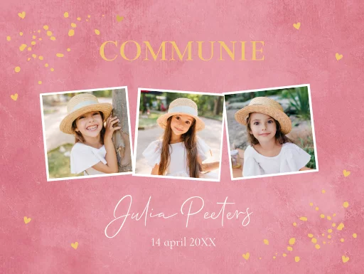 Welkomstbord communie roze voor een meisje met fotocollage. Verwelkom jullie gasten met een prachtig en persoonlijk welkomstbord voor de communie van jullie dochter. Dit welkomstbord is volledig aan te passen naar jullie wensen. Met een formaat van 73 x 55 cm en gemaakt van 5 mm dik forex materiaal, is dit welkomstbord stevig en weerbestendig, perfect voor zowel binnen- als buitengebruik.