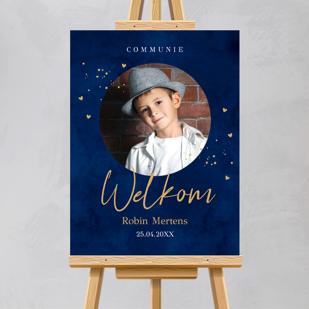 Welkomstbord communie met foto jongen blauw
