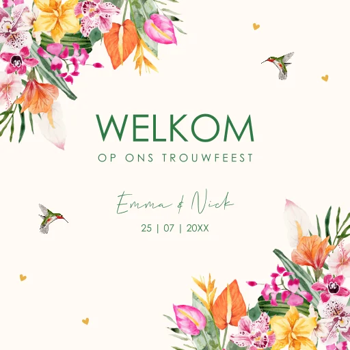Welkomstbord huwelijk tropische bloemen roze