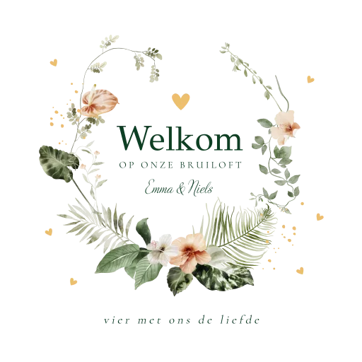 Welkomstbord huwelijk wit tropisch bladeren groen
