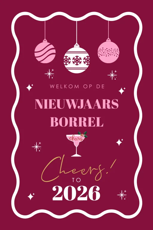 Welkomstbord nieuwjaarsborrel rood roze met kerstballen en golvend frame. Pas de kleuren naar wens aan! Specificaties: • Formaat: 40 x 60 cm • Materiaal: forex 5 mm dik • Weersbestendig