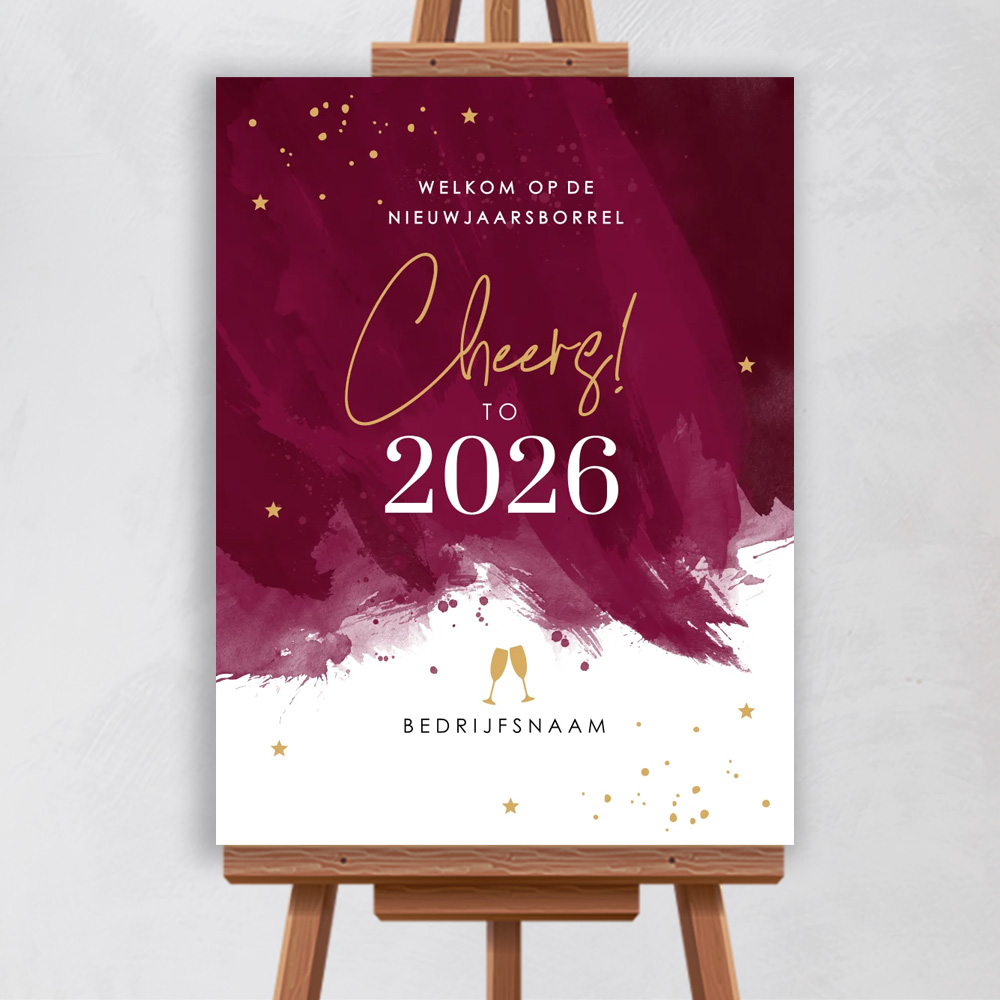 Verwelkom jullie gasten op de nieuwjaarsborrel met een stijlvol welkomstbord rood. Specificaties: • Formaat: 55 x 73 cm • Materiaal: forex 5 mm dik • Weersbestendig