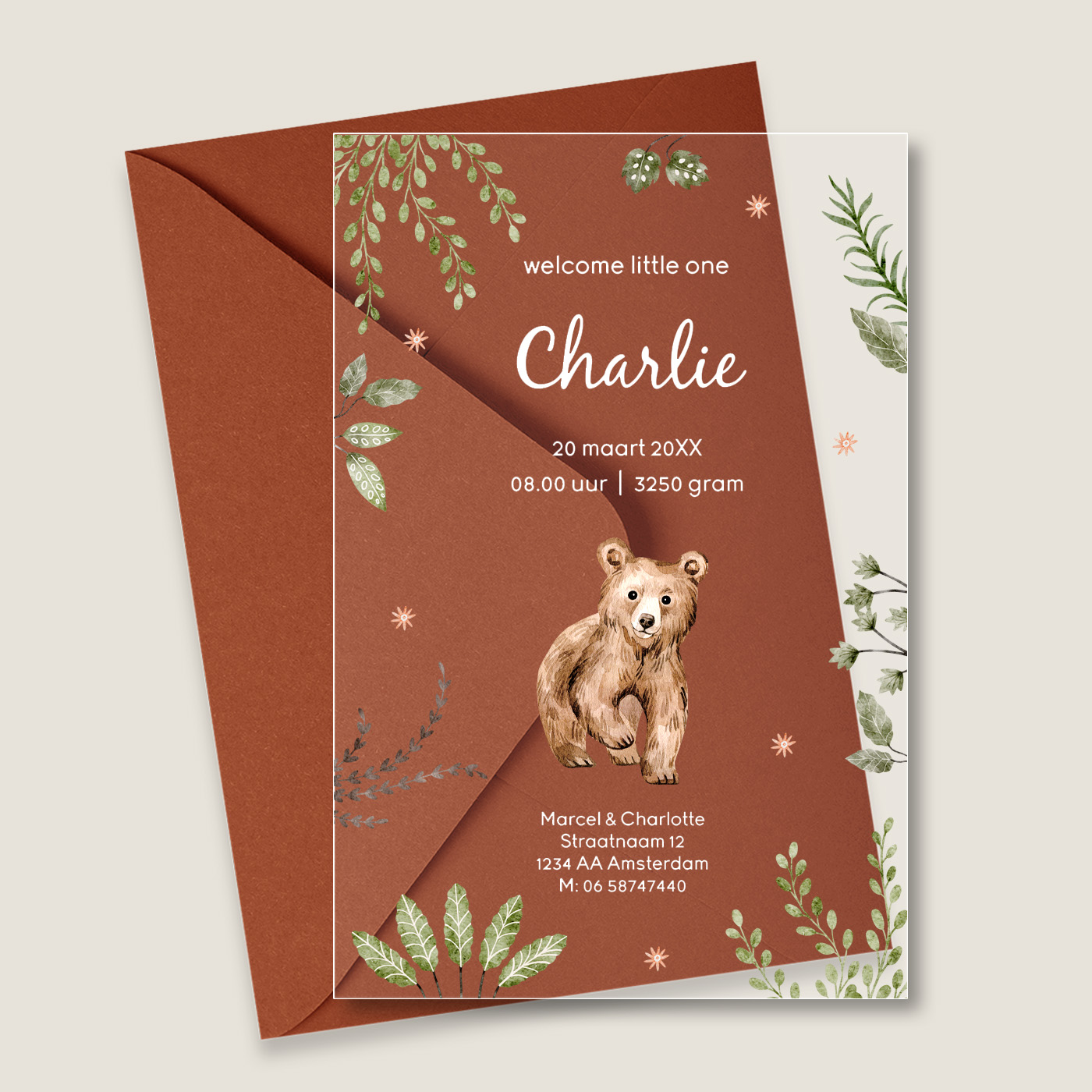Acryl geboortekaartje met lief beertje en groene bladeren. Dit geboortekaartje wordt gedrukt op helder transparant acryl, ook wel plexiglas genoemd, van 2 mm dik.